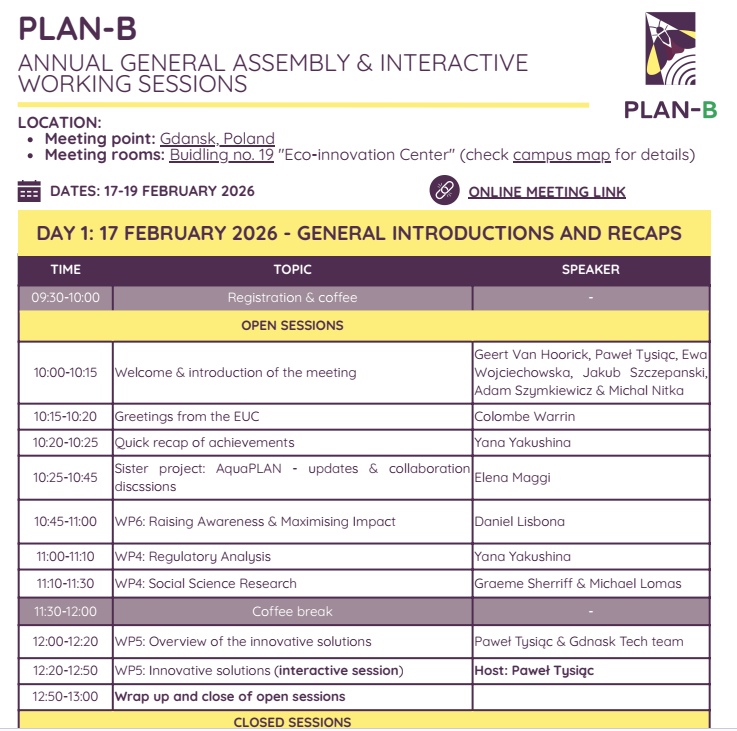 AquaPLAN’s sister project, PLAN-B will hold its Annual General Assembly from 17-19 February 2026 in Gdansk, Poland and online.